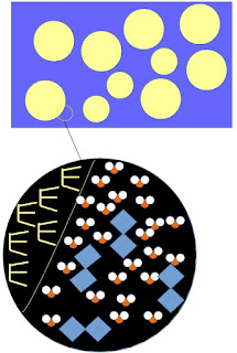 Ce que j'ai d'abord représenté, c'est une émulsion de type huile (en jaune) dans eau (en bleu). En pratique, faisons un "geoffroy", en fouettant de l'huile dans du blanc d'oeuf, par exemple : les protéines et les autres molécules sont trop petites pour être représentées à cette échelle, où la taille des gouttes d'huile est entre 0,001 et 0,1 millimètres.